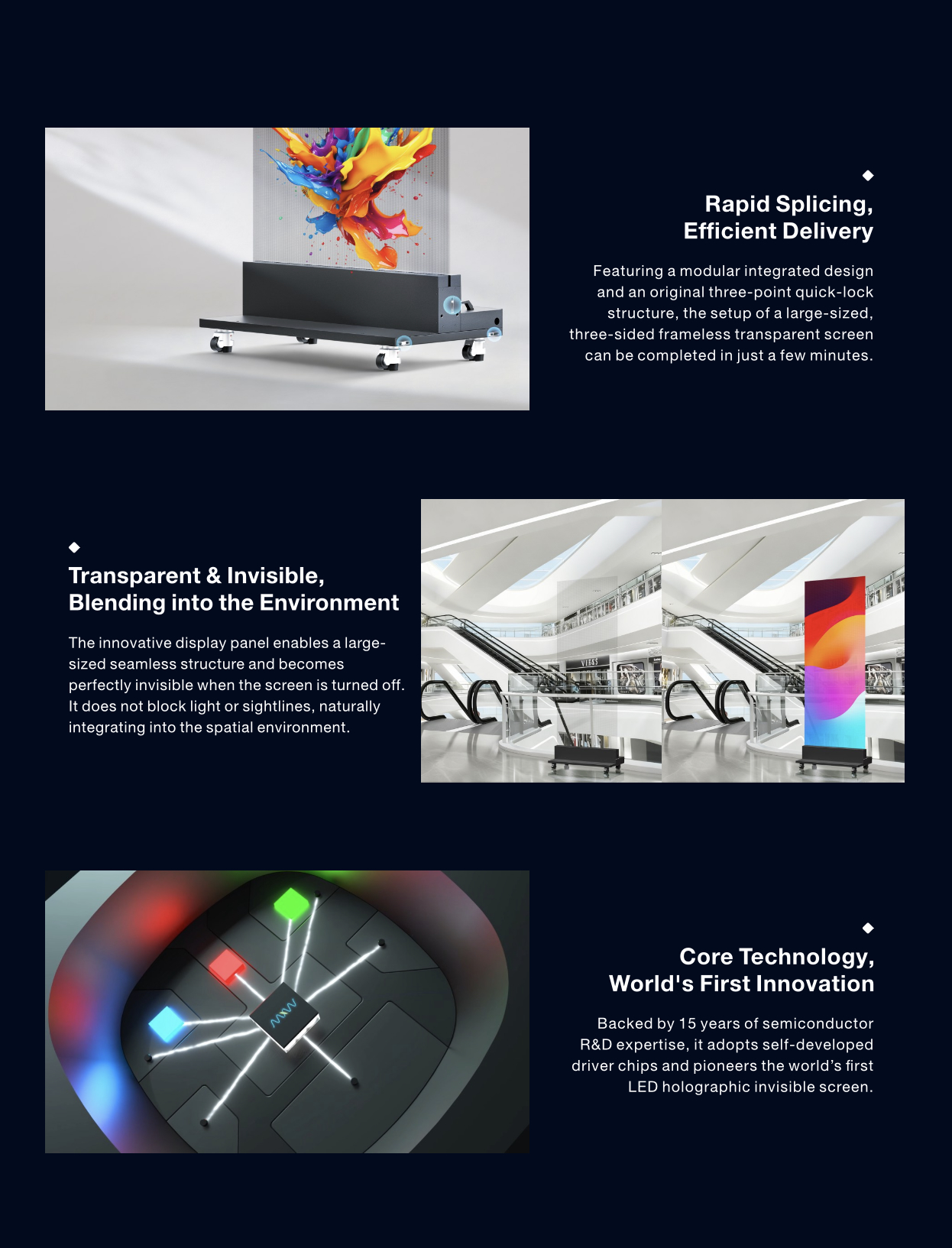 U Screenz ponudu stigao je revolucionarni proizvod koji redefinira digitalno oglašavanje: Holografski nevidljivi display. Ovaj sustav omogućuje postavljanje zadivljujućih prozirnih LED ekrana u samo nekoliko minuta, stvarajući "floating AR magic" – efekt lebdećeg sadržaja u bilo kojem prostoru.